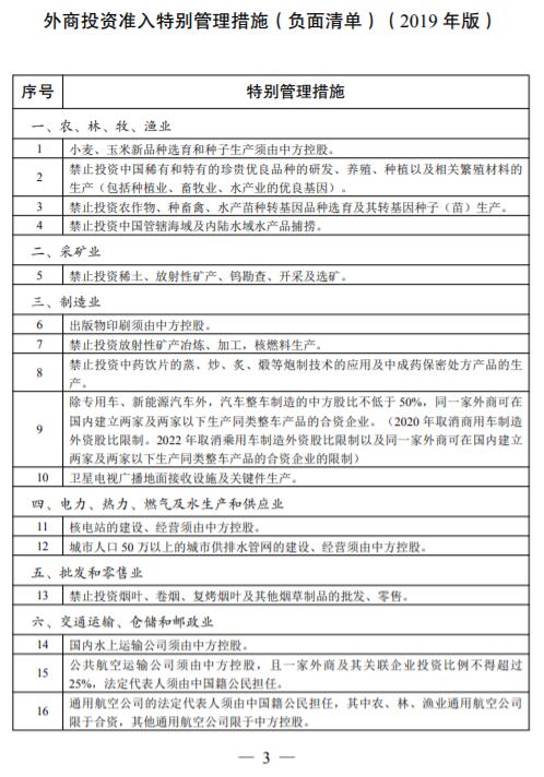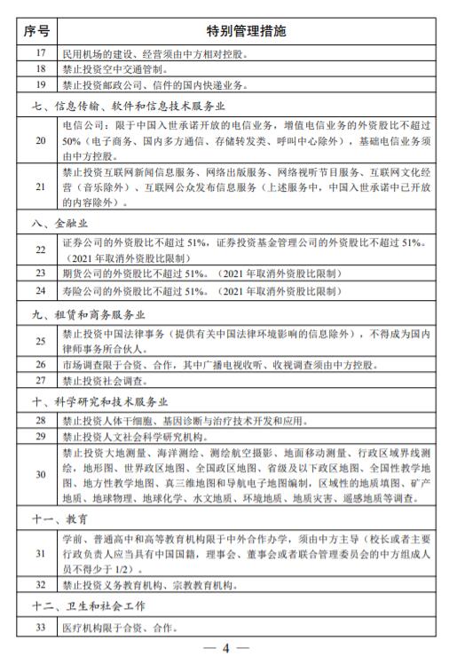 一、《外商投资准入特别管理措施(负面清单)》(以下简称《外商投资准入负面清单》)统一列出股权要求、高管要求等
